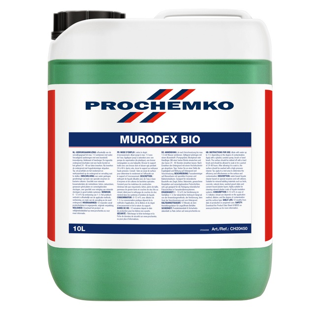 Watergedragen gevelreiniger op basis van speciale bacteriën en enzymen culturen voor het milieuvriendelijk, zuur- en alkalivrij reinigen van minerale bouwmaterialen.