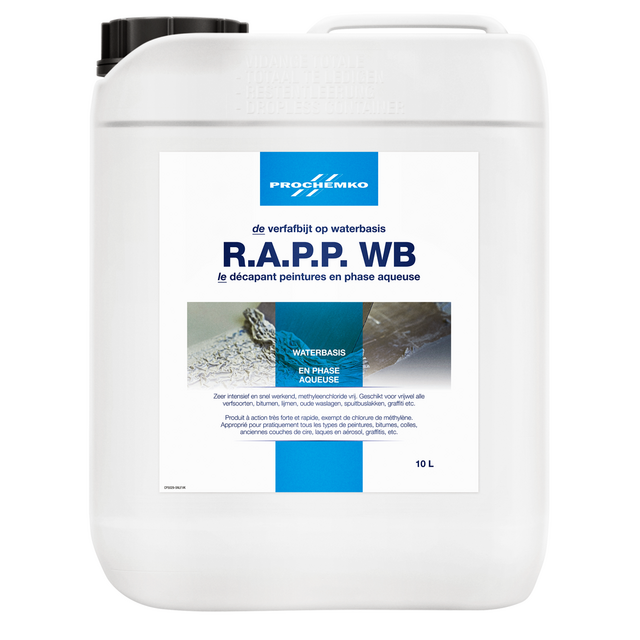 Voor het snel en efficient verwijderen van vrijwel alle verfsoorten. Daarnaast verwijdert het ook bitumen, lijmen, oude waslagen, spuitbuslakken en graffiti. Toepasbaar op vrijwel alle ondergronden. R.A.P.P. WB is op waterbasis en geschikt voor binnengebruik.